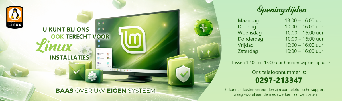 Heeft u een korte vraag over uw e-mail of een eenvoudig probleem waar u even niet uitkomt? Bel ons dan op 0297-213347. Wij staan klaar om deskundige hulp te bieden en kunnen indien nodig uw apparaat op afstand overnemen.