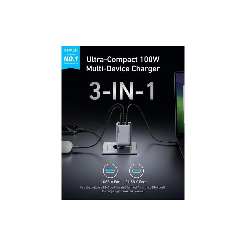 - Power up three devices simultaneously with a total of 100W output through two USB-C and one USB-A port for efficient power distribution.